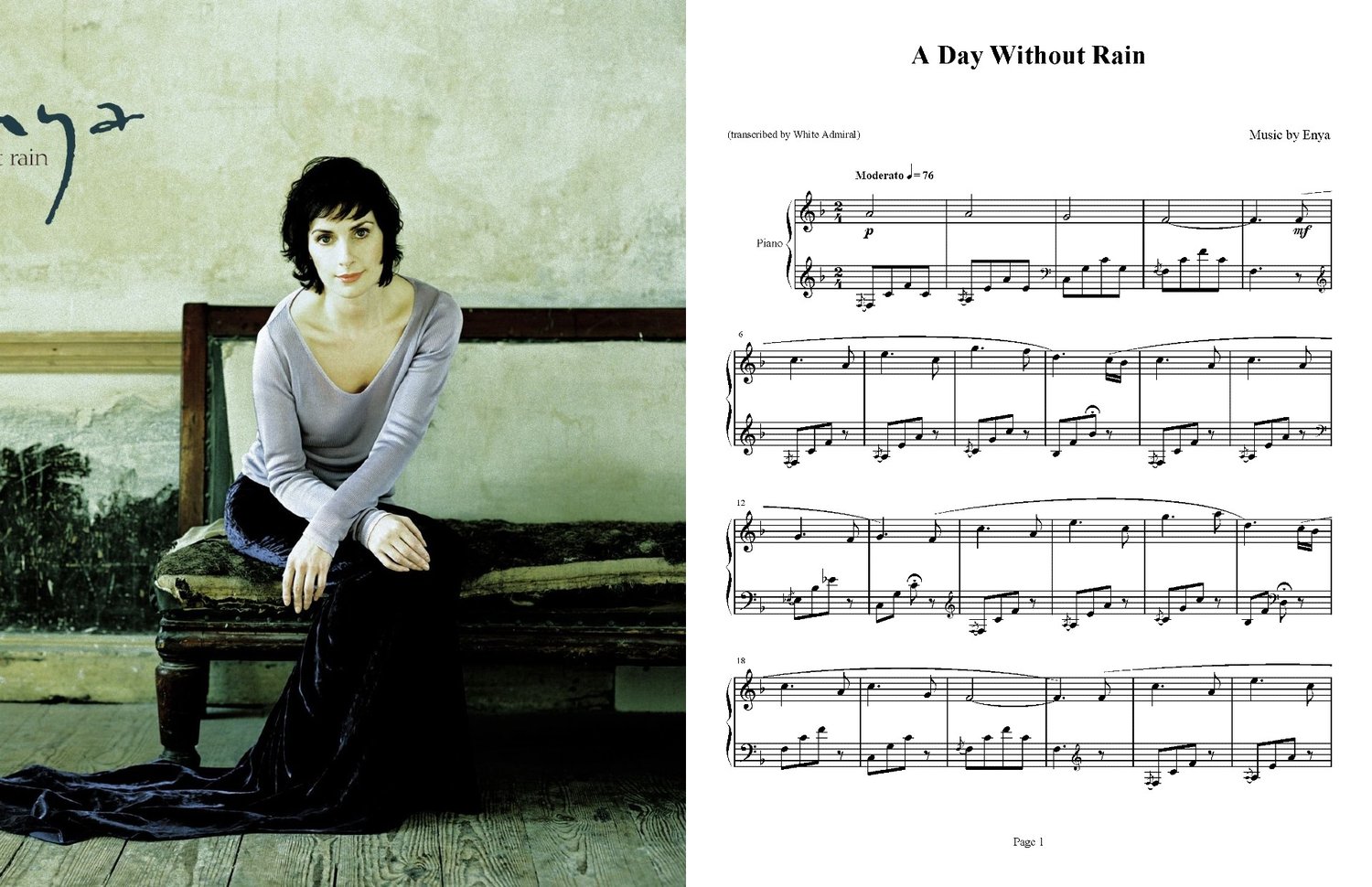 Piano sheet music for "A Day without Rain" composed by Enya. The level of difficulty is intermediate. 4-page PDF file immediately available for download upon purchase.
