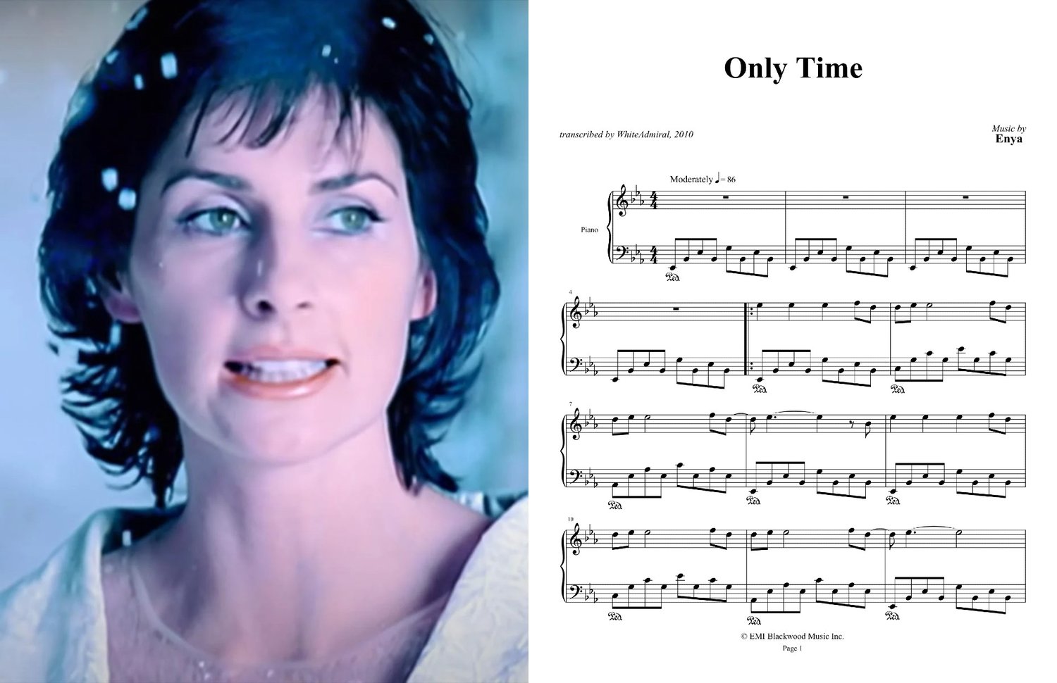 Piano sheet music for "Only Time" composed by Enya. The level of difficulty is intermediate. 4-page PDF file immediately available for download upon purchase.